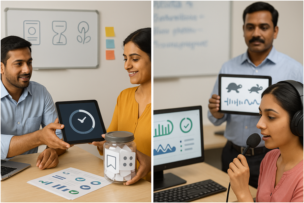 Keep a teacher panel with rubrics for quick overrides and notes. In speaking, let learners compare with a model answer and adjust playback speed.